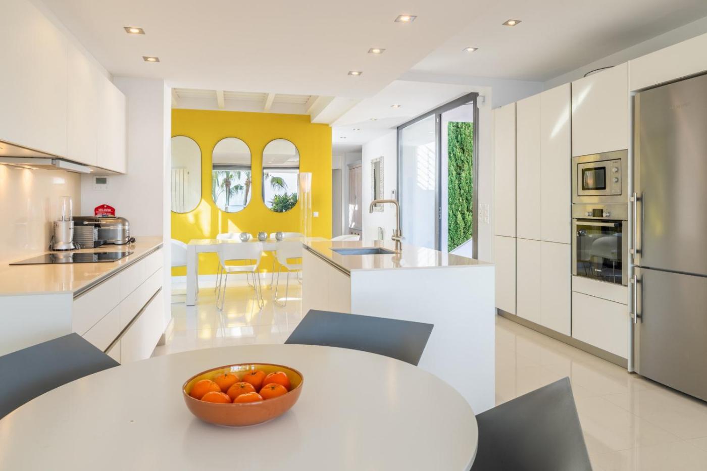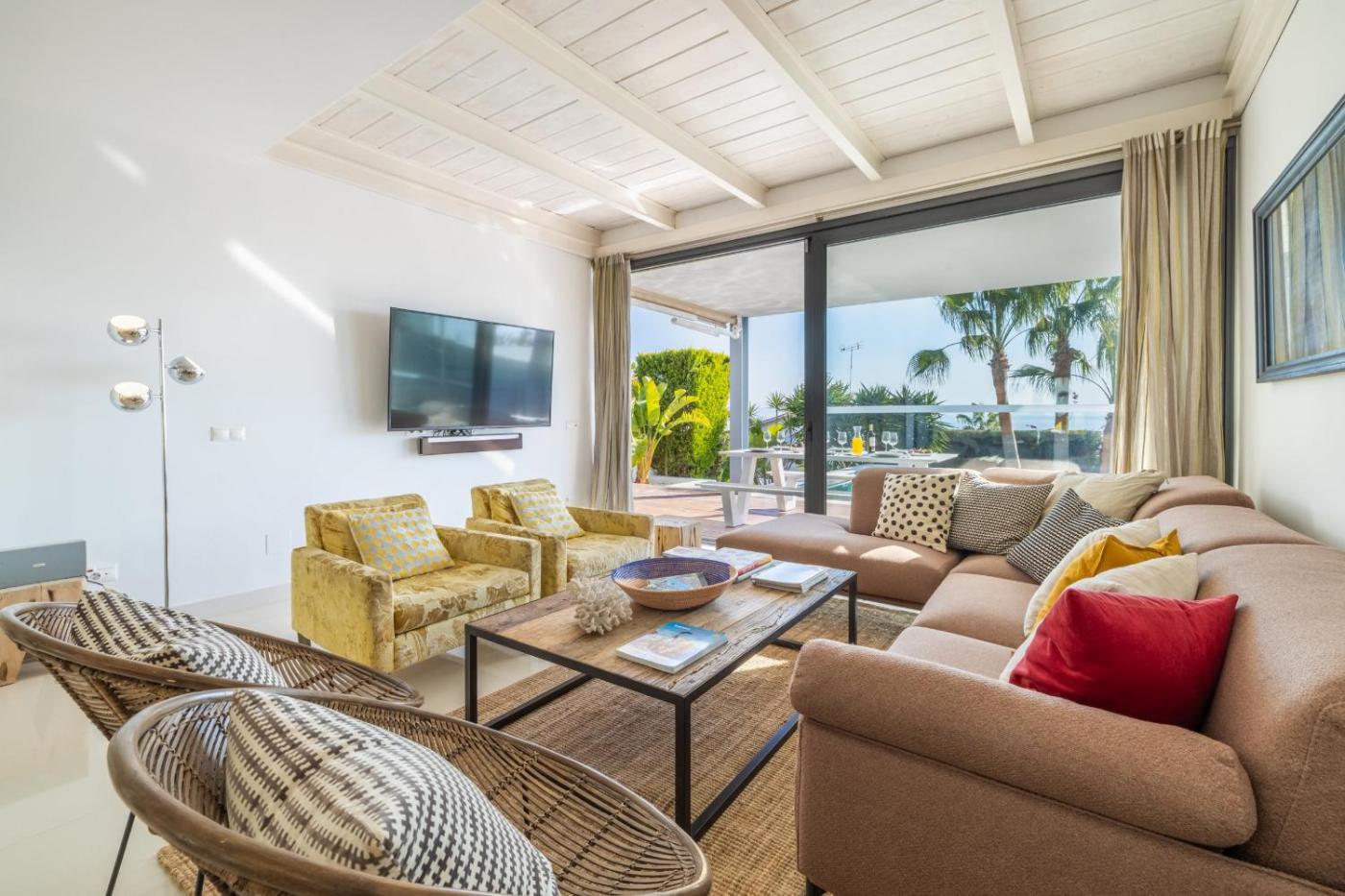 La villa cuenta con 3 dormitorios, 3 baños, ropa de cama, toallas, TV, zona de comedor, cocina totalmente equipada y terraza con vistas al mar.