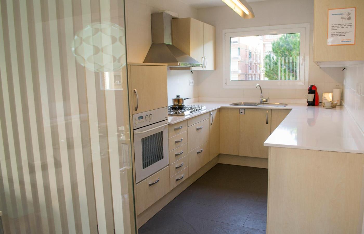 Apartamento con 4 dormitorios. The building key should be pick up in a central reception on Bou de Sant Pere 9 Street, open from 9:00 - 21:30. This bright apartment features modern décor, free WiFi and air conditioning.There are 4 double bedrooms: 2 of them with an en suite bathroom as well as a further bathroom. The bedrooms have balconies overlooking the building’s garden. The kitchen is equipped with a dishwasher, oven and capsule coffee machine. while the living room has a flat-screen TV and dining area.