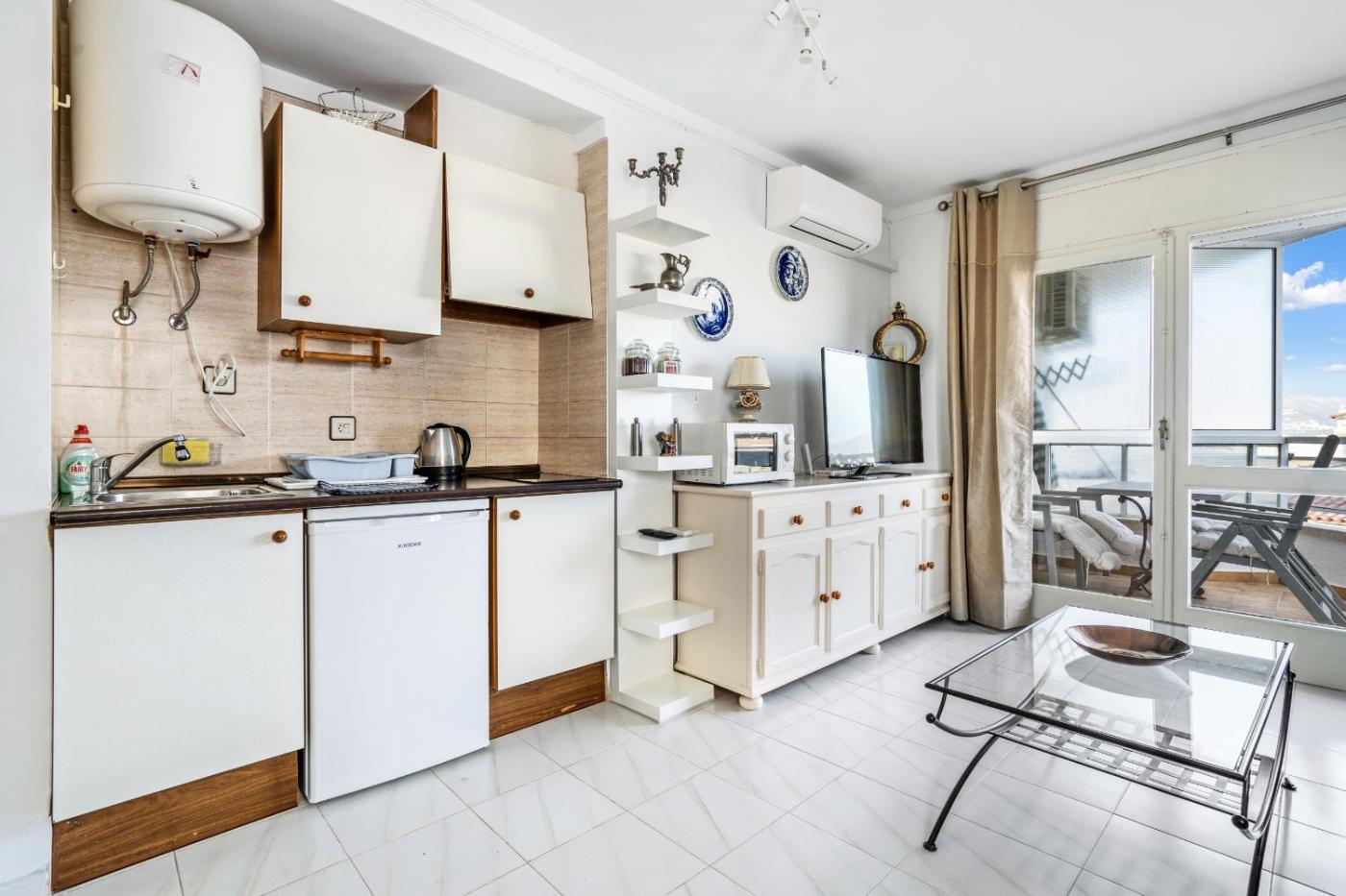 Estudio. In the fully equipped kitchen, guests will find a refrigerator, kitchenware, a microwave and a tea and coffee maker. This air-conditioned studio is comprised of a TV with satellite channels, a private bathroom as well as a terrace with mountain views. The unit has 2 beds.