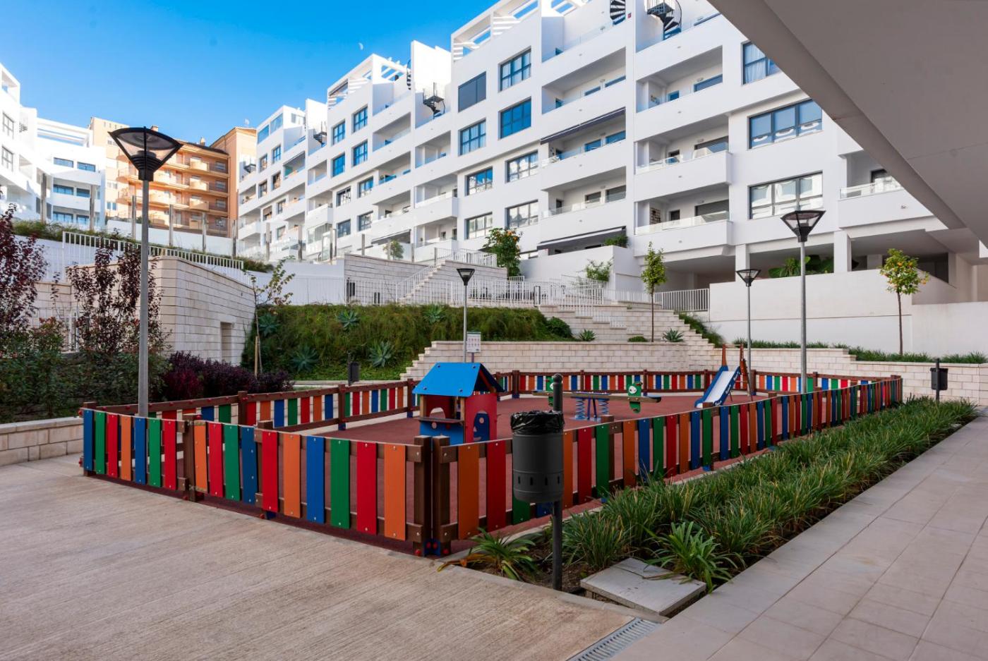 Además de la piscina al aire libre abierta todo el año, el apartamento también ofrece terraza y zona de juegos infantil.