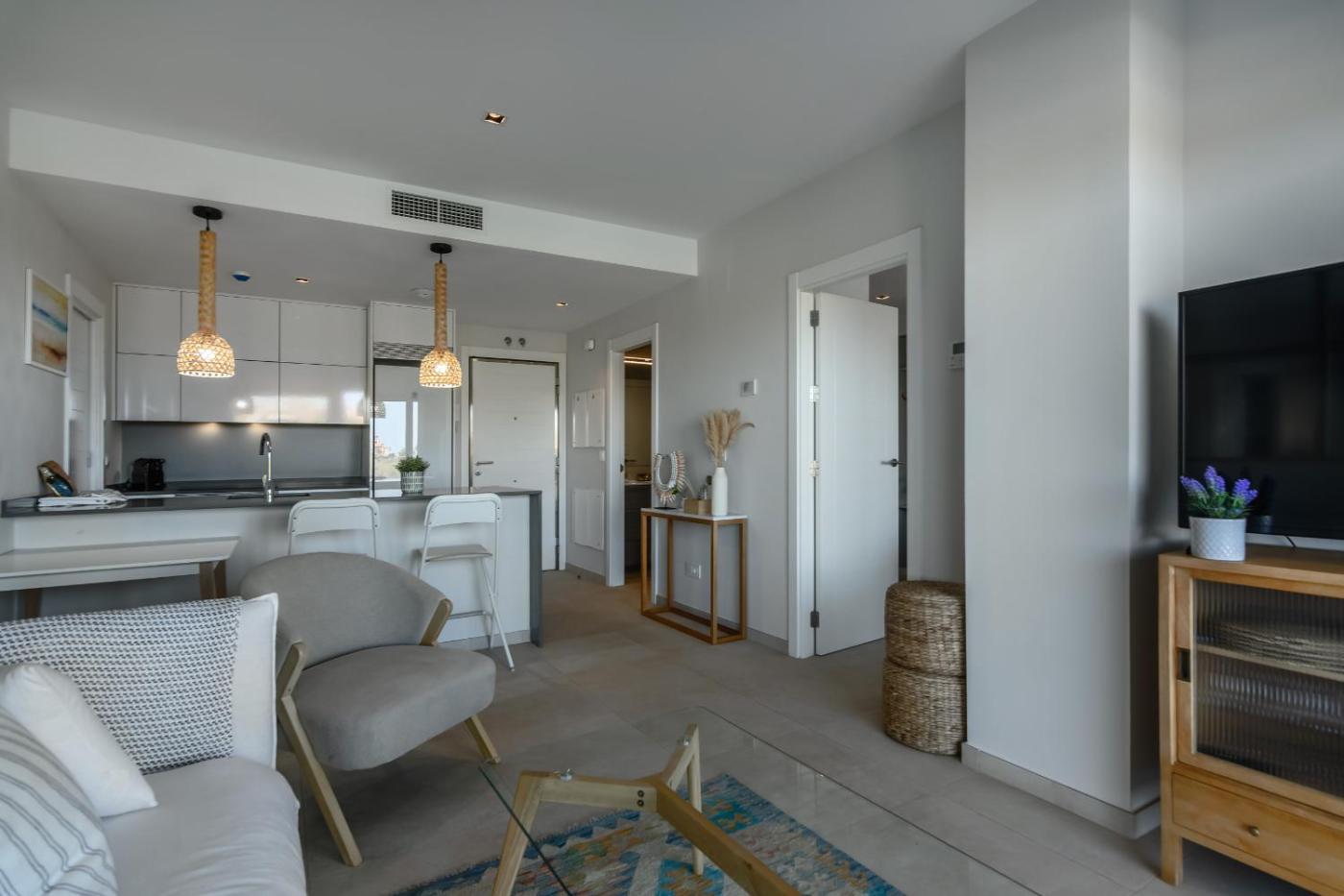 El apartamento tiene 2 dormitorios, 2 baños, ropa de cama, toallas, TV, cocina totalmente equipada y terraza con vistas al mar.