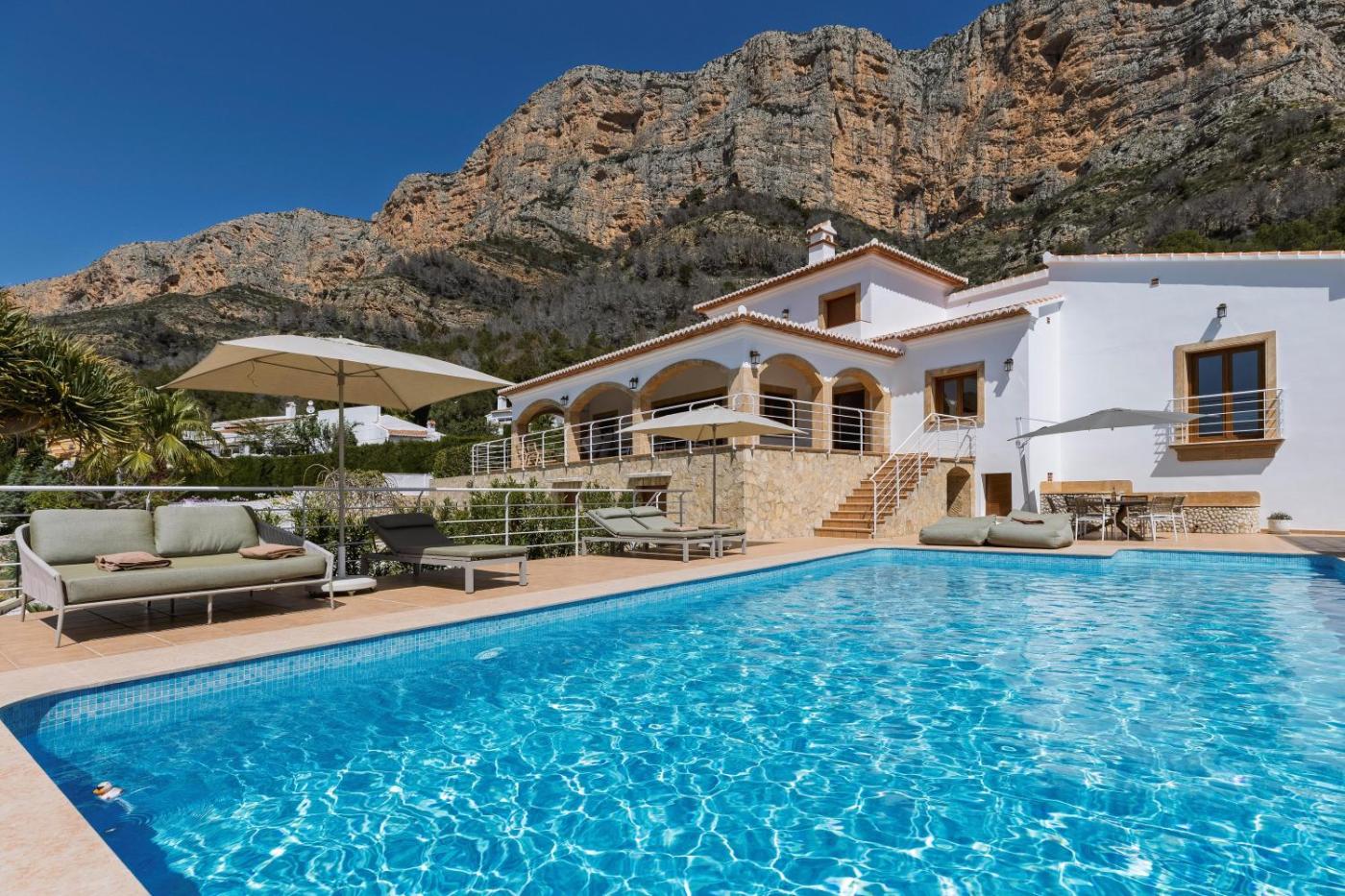 La villa dispone de 5 dormitorios, 3 baños, ropa de cama, toallas, TV con canales por cable, cocina totalmente equipada y terraza con vistas a la montaña.