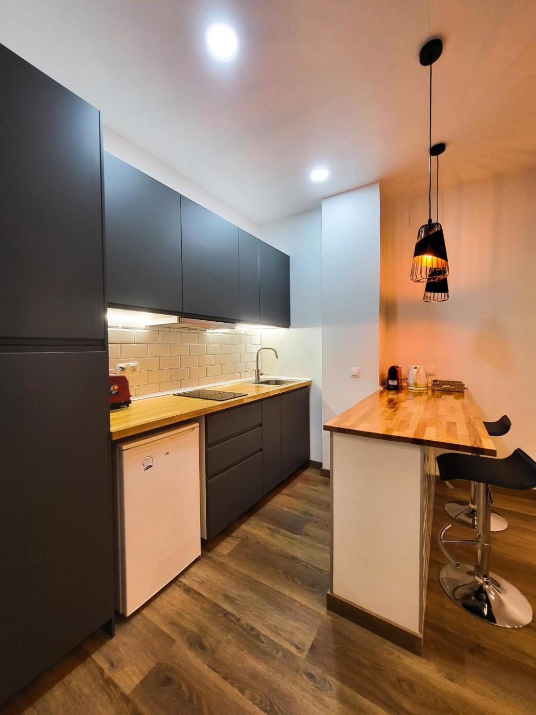 Estudio Estándar. Este estudio dispone de baño privado con ducha, secador de pelo y artÃculos de aseo gratuitos. La cocina está equipada con fogones, nevera, menaje de cocina y microondas. Este estudio cuenta con aire acondicionado, zona de estar con TV de pantalla plana, entrada privada, paredes insonorizadas, teteracafetera y zona de comedor. El alojamiento tiene 2 camas.