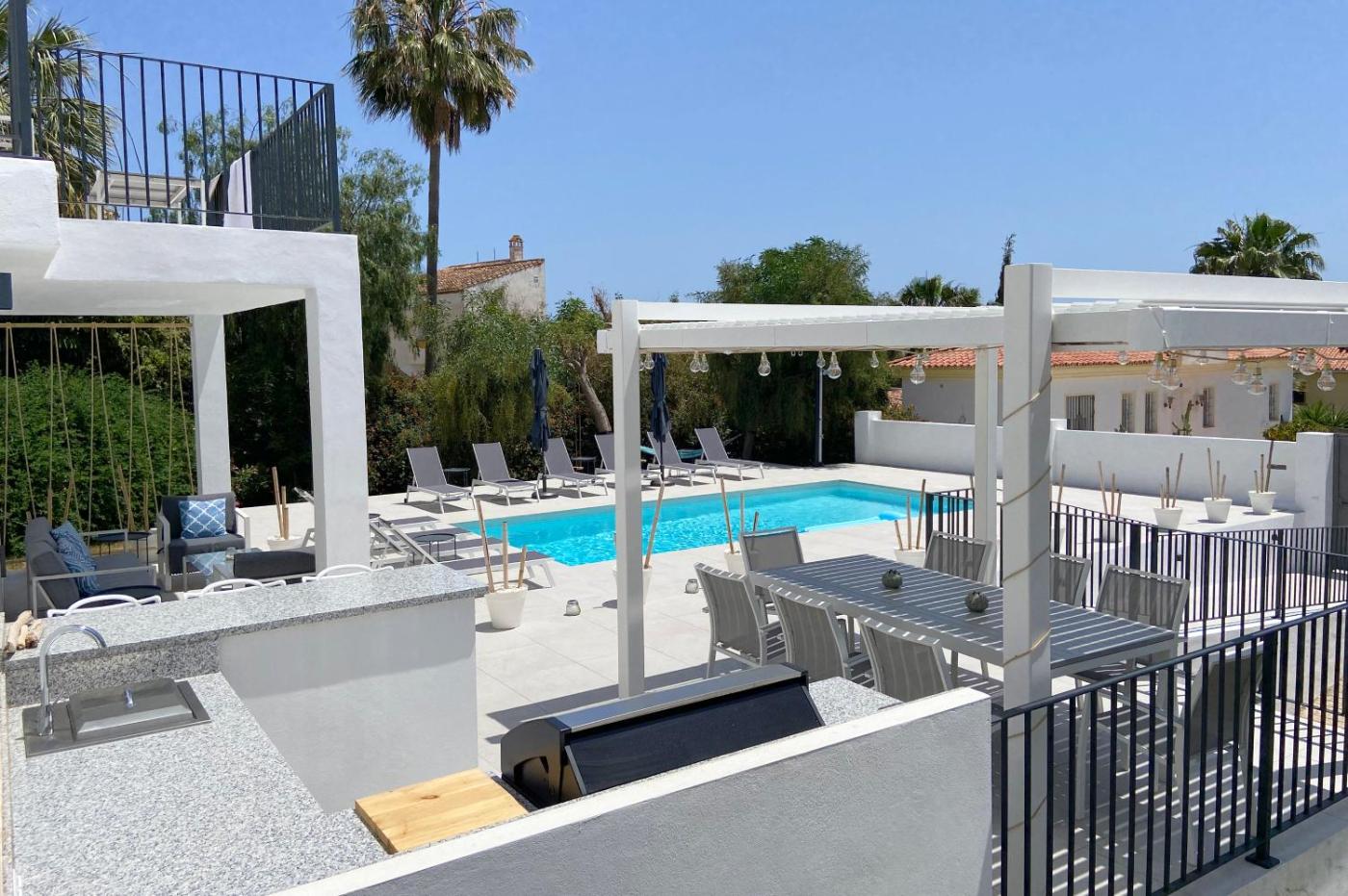 A stunning villa with sea views está en Mijas Costa, a 9 min a pie de Playa de Calahonda - Riviera, y ofrece alojamiento con wifi gratis, aire acondicionado y piscina de temporada al aire libre. Esta villa tiene piscina privada, jardÃn y parking privado gratis.