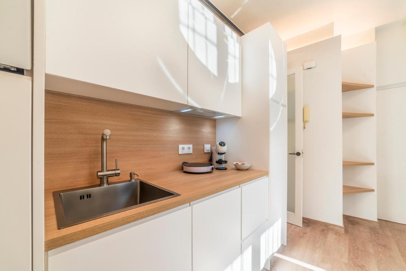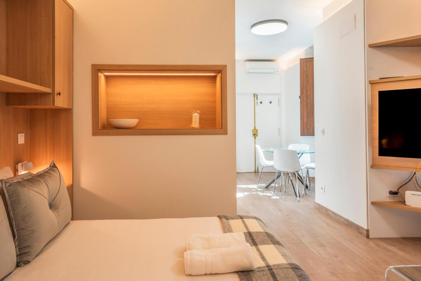 Apartamento Estudio. This air-conditioned apartment is comprised of 1 living room, 1 separate bedroom and 1 bathroom with a shower. In the well-equipped kitchen, guests will find a stovetop, a refrigerator, a dishwasher and kitchenware. The apartment offers a washing machine, a coffee machine, a seating area, a wardrobe, as well as a flat-screen TV. The unit offers 2 beds.